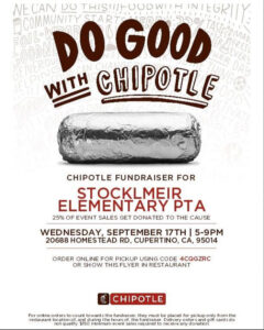 Cupertino Chiptle Dine Out to Support Stocklmeir Elementary. Sep 17, 2025 from 5:00 PM to 9:00 PM