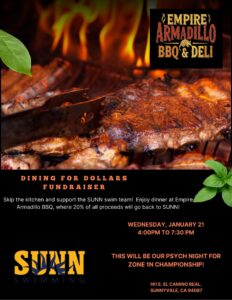 Sunnyvale Empire Armadillo BBQ & Deli Dine Out to Support SUNN Swim Team, January 21 2026, from 4pm to 7.30pm