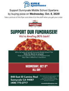 Support Sunnyvale Middle School PTSA by grabbing some delicious pizza from Mountain Mike’s! Whether you dine in or take it to go, 30% of your purchase will go directly to benefit Sunnyvale Middle School’s programs and students.