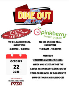 Sunnyvale Pizza My Heart and Pinkberry Dine Out to Support Columbia Middle School, October 22 2025, from 4pm to 9pm