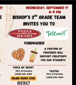 Eat for Bishop Elementary at Pizza My Heart & Tastea – Wednesday, September 17 ( both places are at the same plaza)